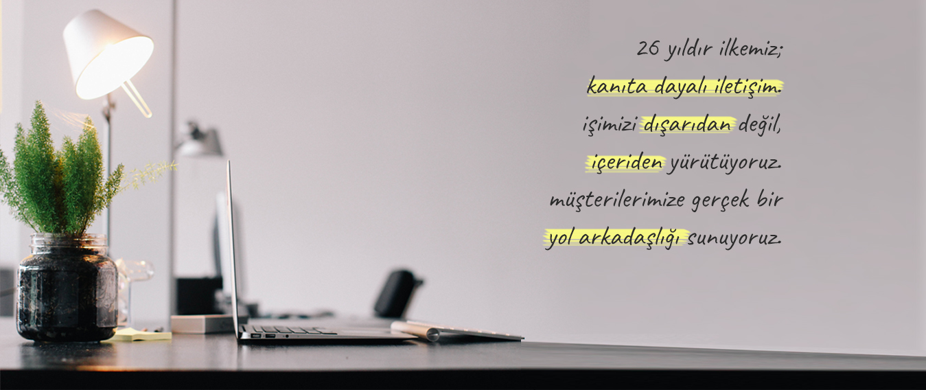 Bize göre iletişim, bir kurumla sosyal paydaşları arasındaki bilgi akışının karşılıklı etkileşim yaratarak doğru zamanda ve ölçülebilir biçimde yönetilmesidir. Bu bilginin üretilmesi, zenginleştirilmesi, doğru mecrada ve doğru zamanda yer almasını sağlayacak yetkinliğimiz ve uzmanlığımızla markanın tüketici gözünde en doğru biçimde konumlanmasını hedefliyoruz. Müşterilerimize iletişimin farklı alanlarında bütünleşik bir hizmet sunuyoruz